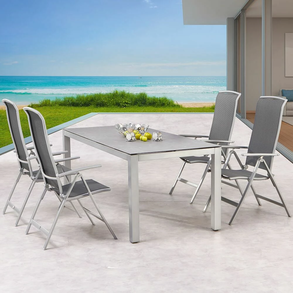 Unsere hochwertigen Gartenmöbel zeichnen sich durch eine hohe Robustheit gegenüber Witterung aus. Egal ob auf dem Balkon, auf der Terrasse oder im Garten platziert, besticht die Sitzgruppe durch ein elegantes Design. Die Sitz- sowie Rückenfläche werden aus luftdurchlässigem Ergotex gefertigt, einem Polyester, welches sich durch eine hohe Komfortabilität, Strapazierfähigkeit, Atmungsaktivität und Wasserresistenz auszeichnet. Das leichte Gestell aus rostfreiem Aluminium sorgt für ein leichtes Handling und wird farblich pulverbeschichtet. Die Tischplatte besteht aus einer witterungsresistenten Keramik- sowie bruchsicheren, kratzbeständigen, 10mm dicken Glas-Schicht.