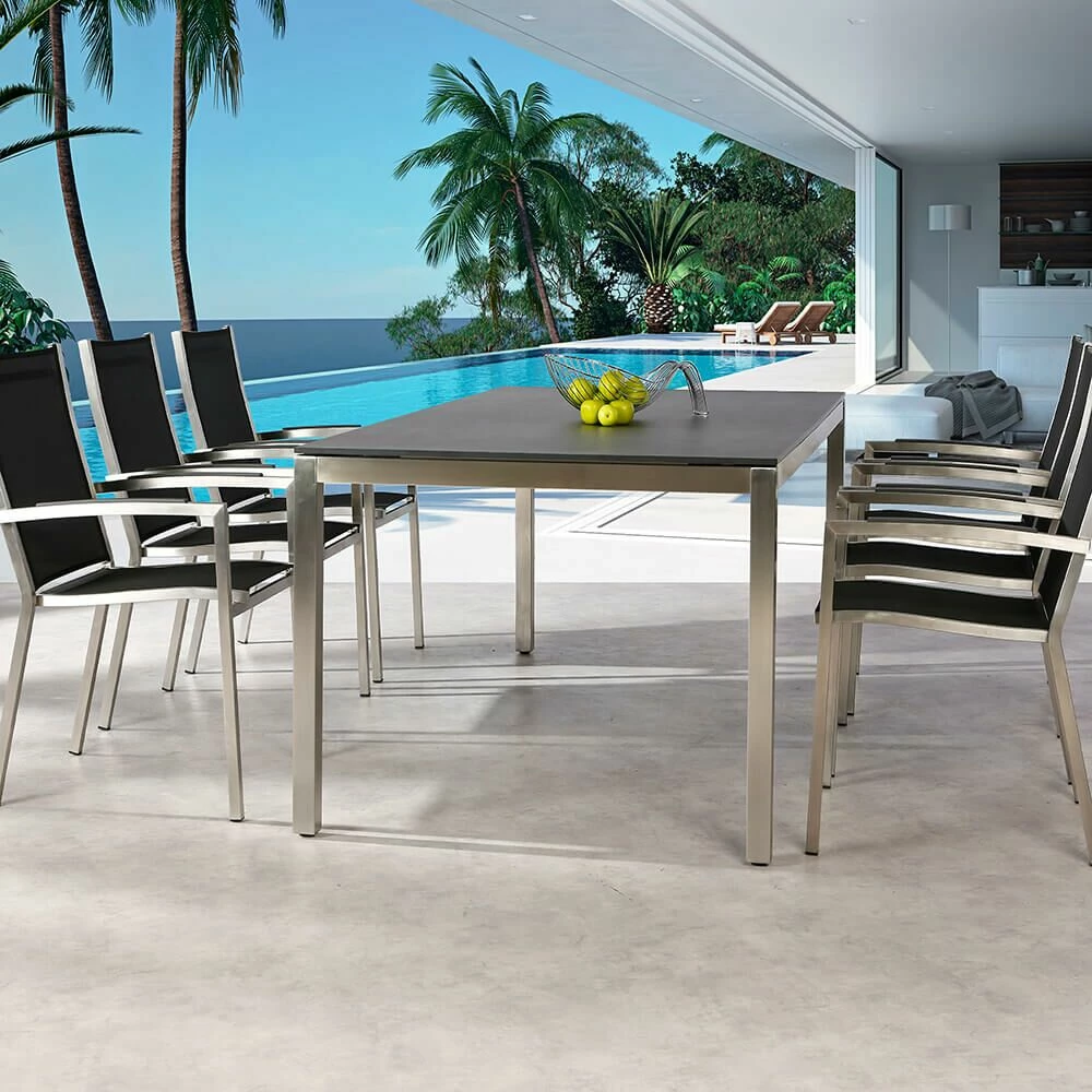 Unsere hochwertigen Gartenmöbel zeichnen sich durch eine hohe Robustheit gegenüber Witterung aus. Egal ob auf dem Balkon, auf der Terrasse oder im Garten platziert, besticht die Gartengarnitur durch ein elegantes Design. Die Sitz- sowie Rückenfläche werden aus luftdurchlässigem Ergotex gefertigt, einem Polyester, welches sich durch eine hohe Komfortabilität, Strapazierfähigkeit, Atmungsaktivität und Wasserresistenz auszeichnet. Das elegante Gestell aus rostfreiem Edelstahl sorgt für ein leichtes Handling. Die Gelenkteile sind besonders stabil und langlebig. Die Tischplatte wird aus robustem HPL-Schichtstoff gefertigt. Das Material ist bis 180°C hitzebeständig, kratzfest und pflegeleicht.