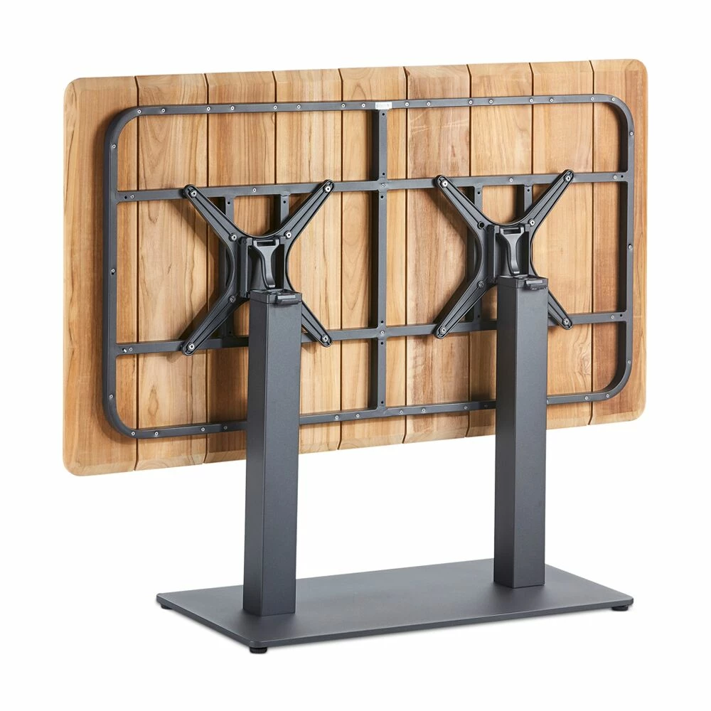Unsere hochwertigen Gartenmöbel zeichnen sich durch eine hohe Robustheit gegenüber Witterung aus. Egal ob auf dem Balkon, auf der Terrasse oder im Garten platziert, besticht der Gartentisch durch ein elegantes Design. Der Outdoor-Tisch ist aus Aluminium, welches farblich beschichtet wird. Die abklappbare Tischplatte ist aus Teakholz. Ausgleichsschrauben an der Bodenplatte geben dem Gartentisch auch auf kleinen Unebenheiten einen sicheren Stand. Der Tisch wird zerlegt mit Aufbauanlietung geliefert.