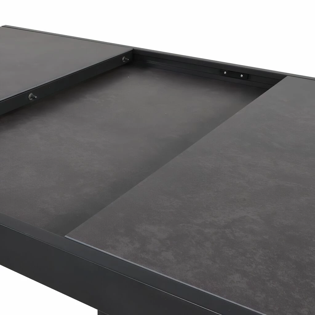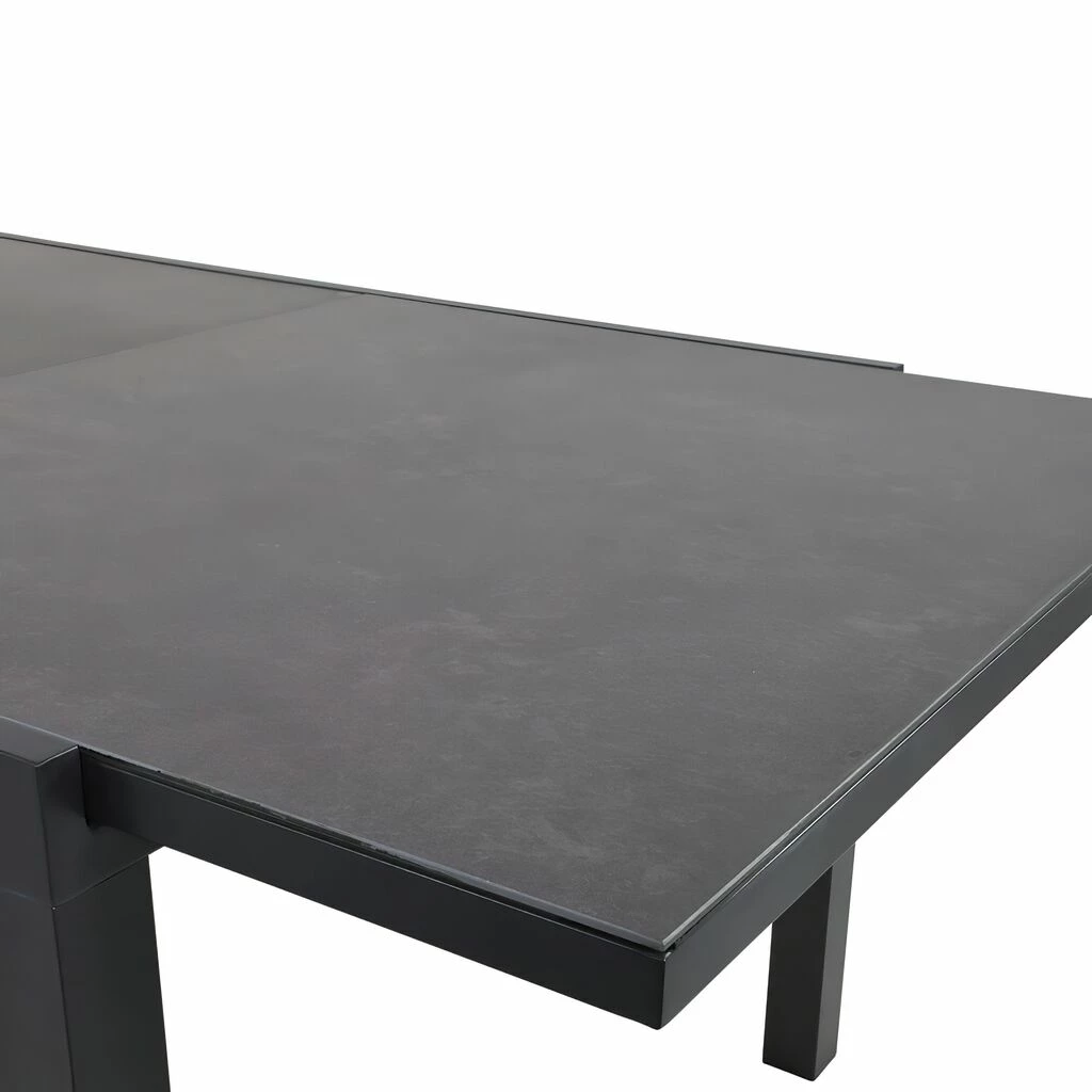 Dieser robuste Gartentisch wird unter ständiger Qualitätskontrolle aus Aluminium gegossen und erhält eine farbige Pulverbeschichtung. Die Tischplatte besteht aus Glas mit einer Beschichtung in Keramikoptik. Das Outdoor-Möbelstück ist wetterfest. Zur Reinigung sind Wasser und ein Schwamm ausreichend. Von säurehaltigen Reinigungsmittel wird abgeraten. Diese können die Oberfläche schädigen und zu einem Verlust der Wetterbeständigkeit führen.