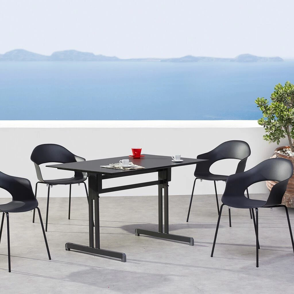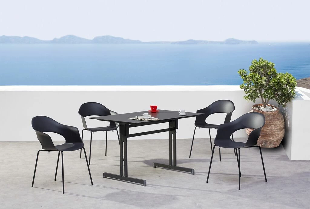 Unsere hochwertigen Gartenmöbel zeichnen sich durch eine hohe Robustheit gegenüber Witterung aus. Egal ob auf dem Balkon, auf der Terrasse oder im Garten platziert, besticht die Sitzgruppe durch ein elegantes Design. Der Outdoor-Tisch ist aus Vierkant-Stahlrohren, welche farblich beschichtet sind. Die abklappbare, UV-beständige Tischplatte ist aus 10 mm starkem, kratzfesten HPL. Ausgleichsschrauben an den Beinen geben dem Gartentisch auch auf kleinen Unebenheiten einen sicheren Stand. Der Tisch wird zerlegt mit Aufbauanlietung geliefert. Die Gartenstühle sind mit einem verzinkten Stahlrohrgestell sowie glasfaserverstärktem Kunststoff gefertigt und haben eine Rückenlehne mit einer Höhe von 33 cm.