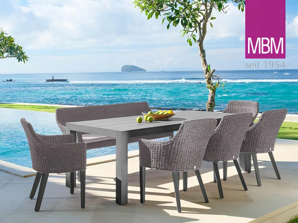 Bequemer Gartensessel mit Arm- und Rückenlehne in Grau. Der Sessel von MBM wird aus Resysta gefertigt. Die Sitzschale besteht aus Mirotex Twist, welches fest auf ein Aluminiumgestell aufgeflochten wird. TORTUGA ist eine Hommage an die Kolonialzeit. Der Gartensessel ist UV-beständig und wetterfest und eignet sich für einen schönen Platz im Garten, auf dem Balkon oder der Terrasse.
