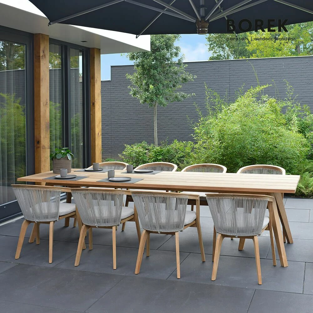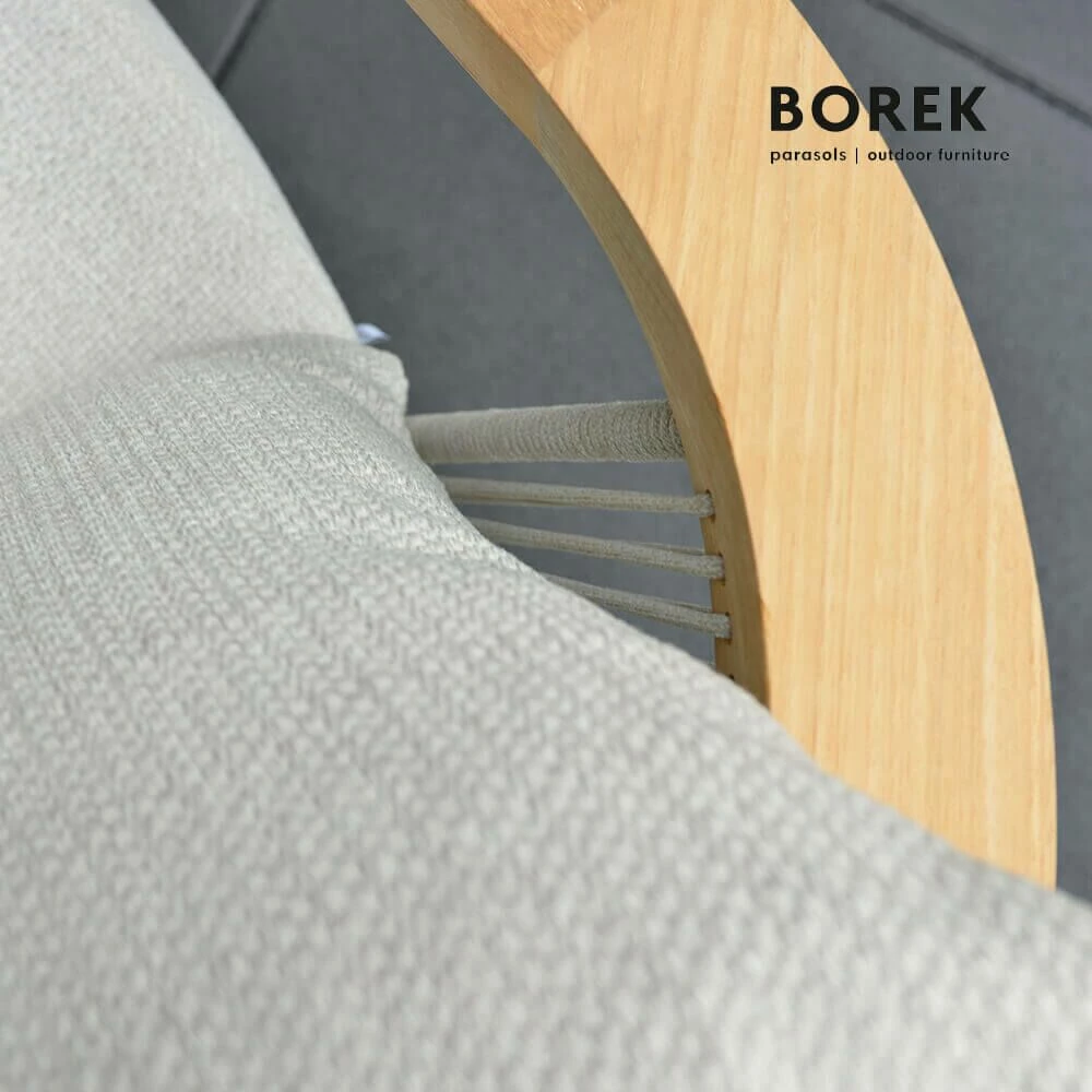 Die Gartenmöbel des Herstellers Borek zeichnen sich durch eine dauerhafte Stabilität und ein modernes Design aus. Eine hochwertige Auswahl des Teakholzes gibt dem Möbelstück eine hohe Stabilität. Hinzu kommen robuste Materialien für die Bespannung. Die Sitzgruppe ist frost- und hitzbeständig sowie pflegeleicht. Kleine Risse im Holz, welche sich im Laufe der Zeit bilden, sind normal und die Gartenmöbel verlieren hierdurch nichts an Robustheit. Neben Sitzgruppen bietet der Hersteller auch Loungemöbel, Gartenliegen und Sonnenschirme, die Sie ebenfalls in unserem Shop online bestellen können. Das Ardenza-Seil kann mit dem Borek Fabric Cleaner gerinigt und mit dem Borek Fabric Protector geschützt werden. Für die Reinigung und Pflege des Teakholzes empfehlen wir Borek Teak Cleaner und Borek Teak Protector sowie Borek Teak Sealer. Hierdurch kann auch ergrautes Holz wieder zum Strahlen gebracht werden.
