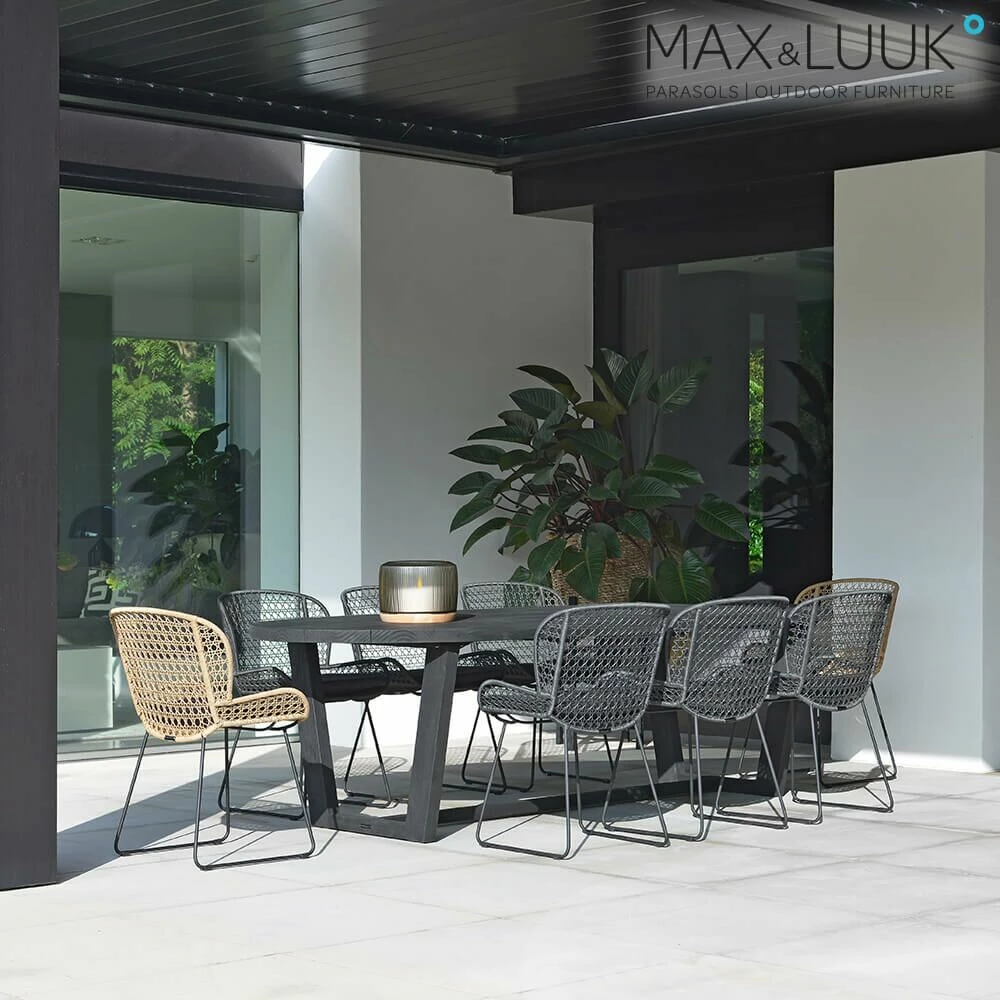 Die Esstische Lauren von Max & Luuk werden aus Teakholz gefertigt. Im Freien ändert das Holz im Laufe der Zeit seinen Farbton und wird silbergrau, da die Pigmente in der Oberflächenschicht des Holzes verblassen. Jedes Stück Teakholz ist ein Naturprodukt und hat eine individuelle Struktur. Durch Wettereinflüsse, starke Temperaturschwankungen oder eine Änderung des Feuchtigkeitgehaltes im Holz, können Risse auftreten. Dieses „Schwinden“ ist ein natürlicher Vorgang, welcher keinerlei Einflüsse auf die Qualität des Gartenmöbels hat. Drei bis vier Mal im Jahr sollte das Holzmöbel mit einem Teak Cleaner von Schmutz befreit werden. Die Verwendung eines Hochdruckreinigers wird nicht empfohlen. Mit einem Teak Protector kann das Holz vor Flecken, zum Beispiel von Speisen oder Getränken, geschützt werden. Im Winter können Teakholzmöbel an einem trocknen Ort gelagert werden.