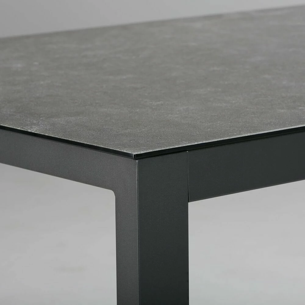 Unsere hochwertigen Gartenmöbel zeichnen sich durch eine hohe Robustheit gegenüber Witterung aus. Egal ob auf dem Balkon, auf der Terrasse oder im Garten platziert, besticht der Tisch durch ein elegantes Design. Das Gestell besteht aus Aluminium, einem rostfreien, witterungsresistenten und pulverbeschichteten Metall. Die Tischbeine sind mit Ausgleichsschrauben ausgestattet, sodass der Gartentisch auch auf unebenem Untergrund sicher steht. Die Tischplatte wird kratzfest und robust aus einer Keramik-Schicht mit einer 10mm starken, bruchsicheren Glasplatte gefertigt.
