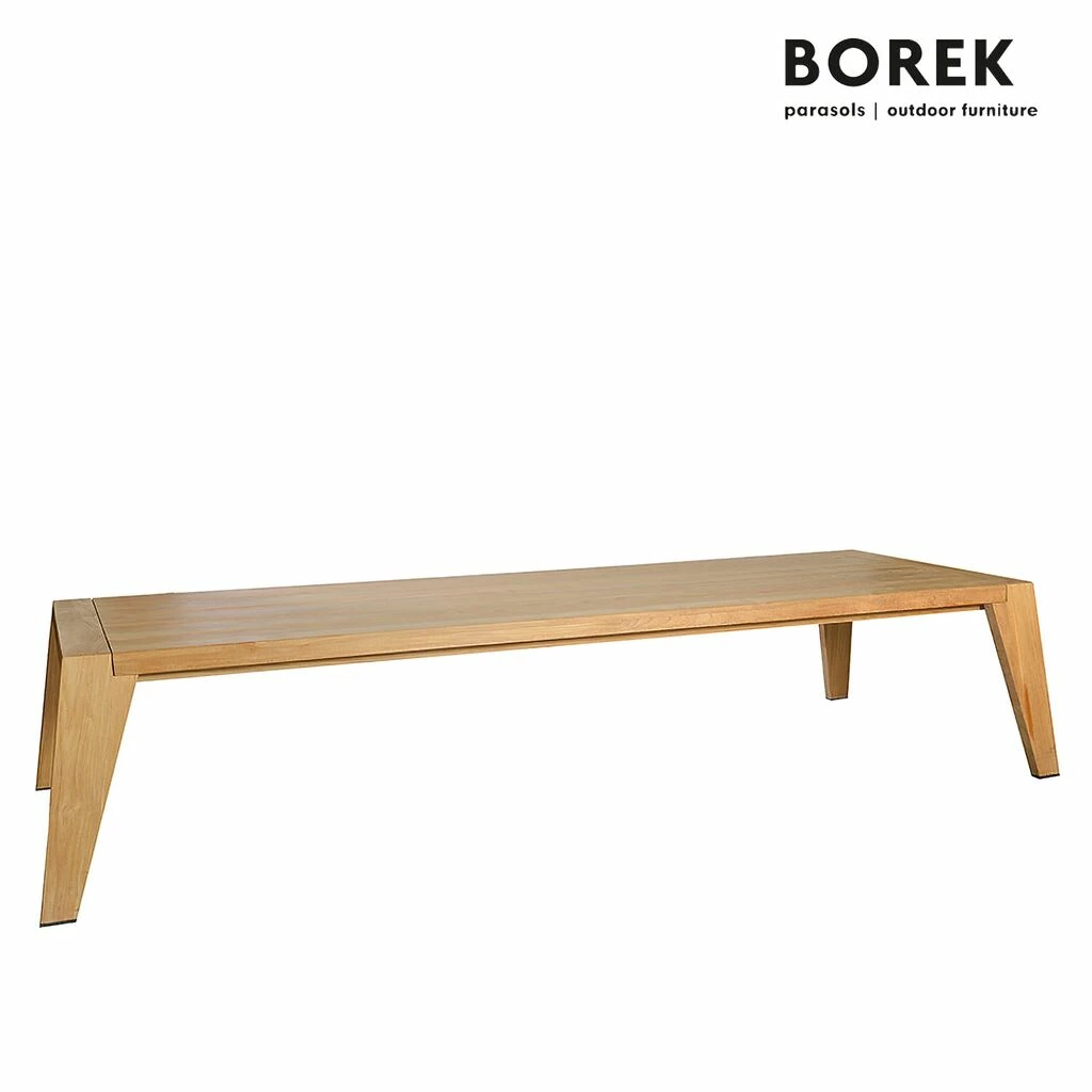 Das Teakholz der Tectona Grandis ist stabil gegenüber UV-Strahlung, Chlor sowie Salzwasser. Im Laufe der Zeit altert das unbehandelte Hartholz. Kleine Risse sind normal und haben keinen Einfluss auf die natürliche Robustheit. Eine regelmäßige Reinigung mit einem Teak Cleaner wird empfohlen. Mittels Nachbehandlung mit dem Borek Teak Protector wird das Holz gesättigt, sodass Nässe und Schmutz nicht eindringen können. Um ergrautes Holz wieder frisch aussehen zu lassen, wird der Borek Teak Sealer empfohlen, welches das natürliche Braun des Teakholzes wieder zum Vorschein bringt.