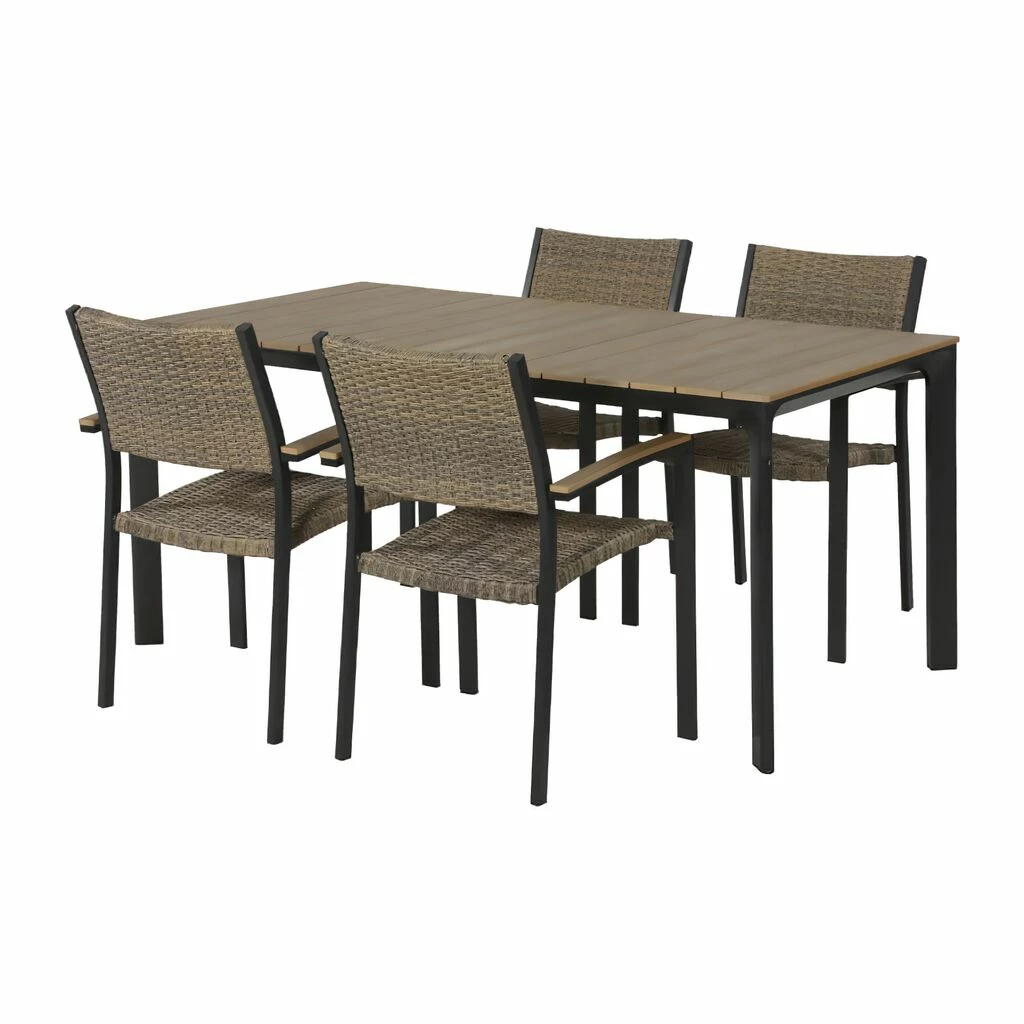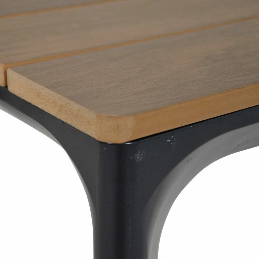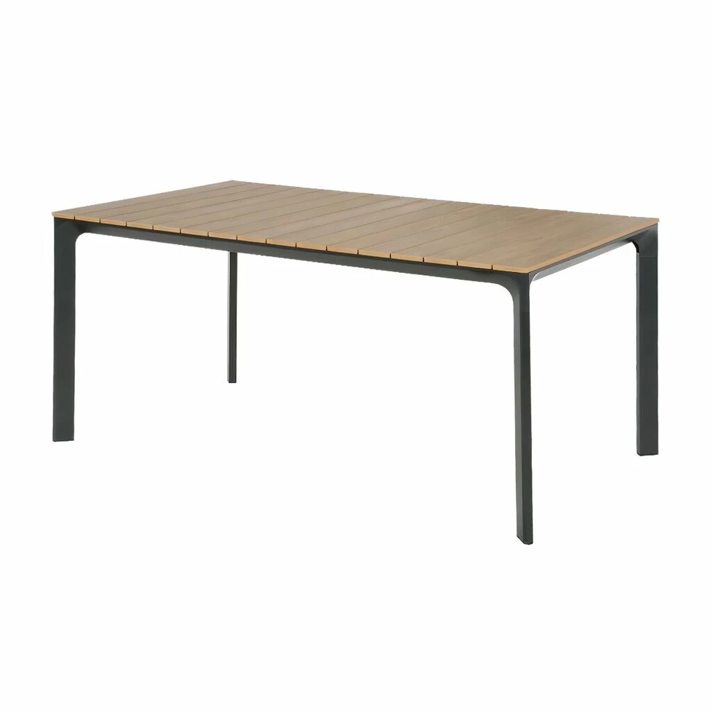 Diese robusten Gartentische werden unter ständiger Qualitätskontrolle aus Aluminium gegossen und erhalten eine graue Beschichtung. Das Outdoor-Möbelstück ist robust und wetterfest. Die Holzoptik wird aus Polywood gefertigt, einem Kunststoff, welchem in der Fertigung natürliche Holzfasern zugesetzt werden. Polywood weist holzähnliche Eigenschaften, wie die natürlichen Unregelmäßigkeiten von Naturholz, auf. Somit zeichnen sich die Gartenmöbel durch eine hohe Individualität aus. Zur Reinigung sind Wasser und ein Schwamm ausreichend. Von säurehaltigen Reinigungsmittel wird abgeraten. Diese können die Oberfläche schädigen und zu einem Verlust der Wetterbeständigkeit führen.