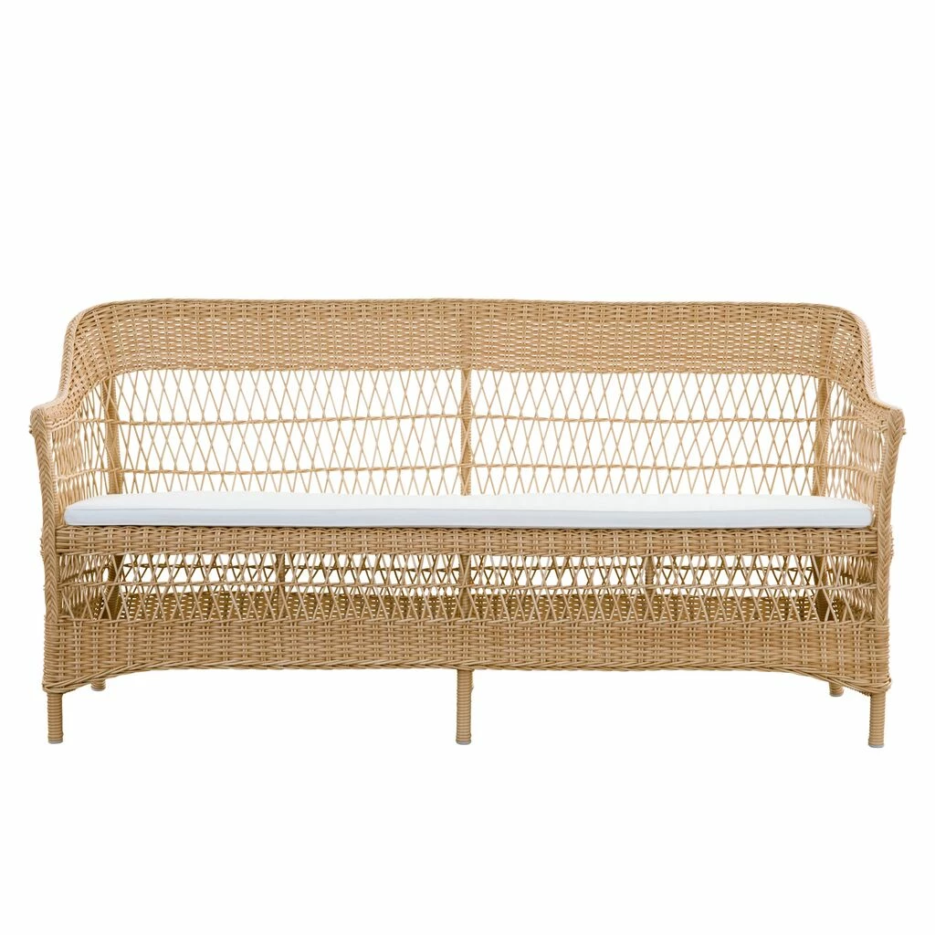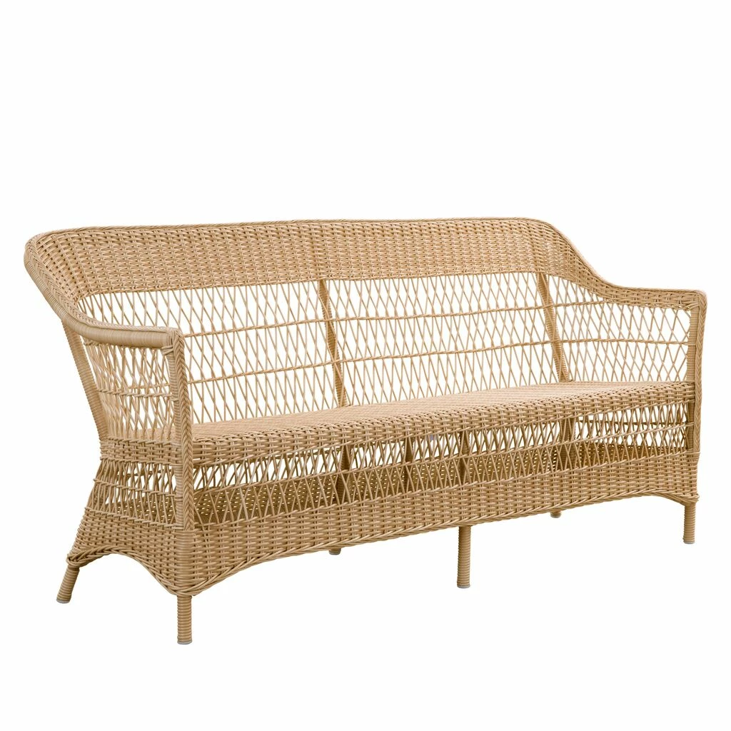 Das Korbdesign des Geflechtssofas entsteht durch eine synthetische Rattan Faser, welche in Handarbeit um ein Aluminiumgestell geflochten wird. Die verwendeten Materialien sind absolut wetterbeständig und für den ganzjährigen Gebrauch im Freien geeignet. Das 3-Sitzer Gartensofa überzeugt durch die elegante Form und hochwertige Verarbeitung.