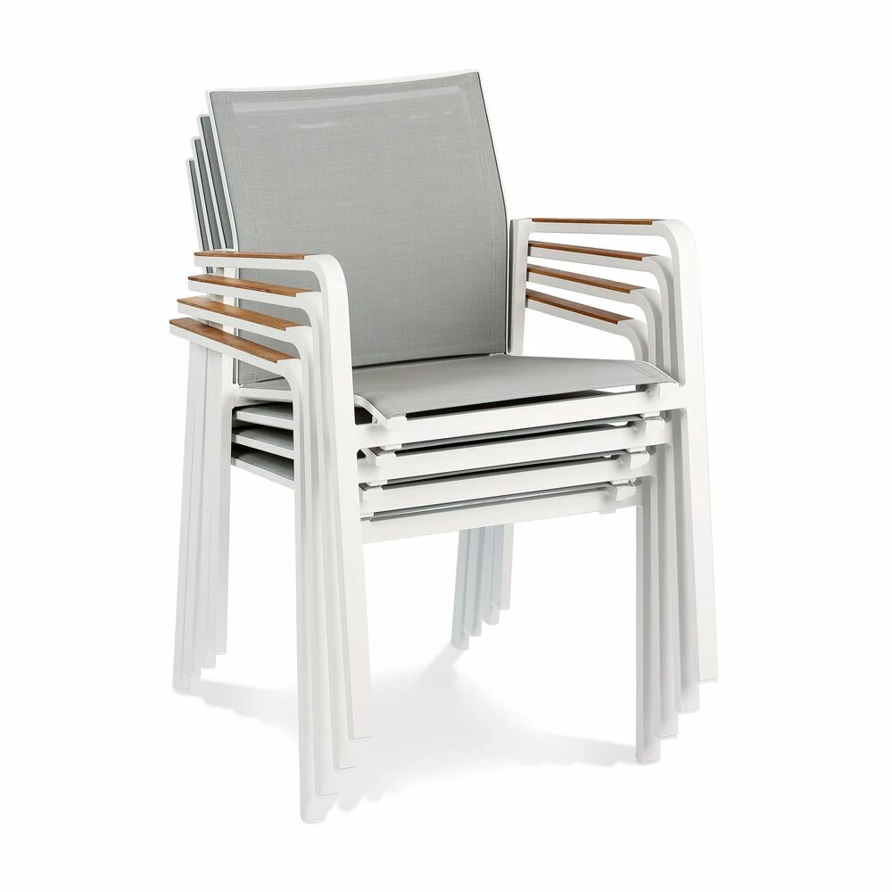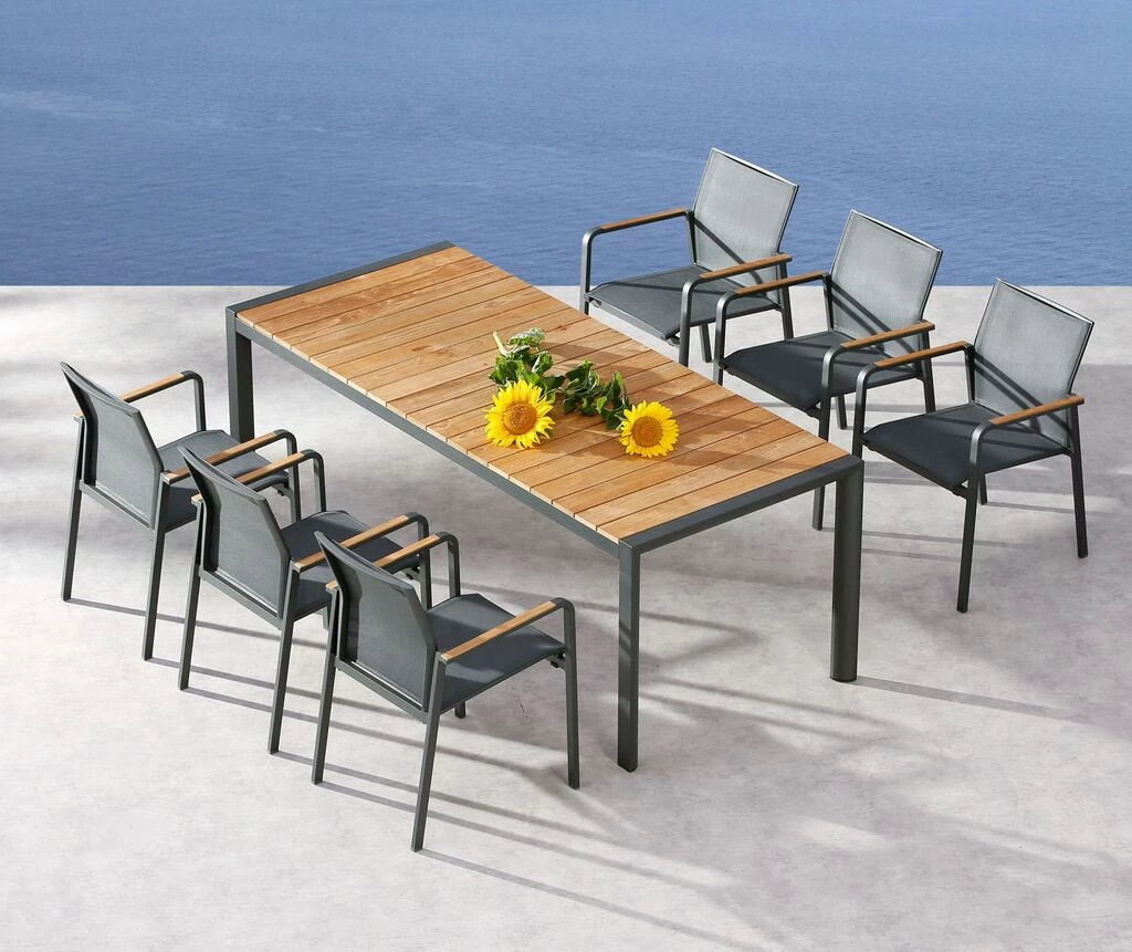 Unsere hochwertigen Gartenmöbel zeichnen sich durch eine hohe Robustheit gegenüber Witterung aus. Egal ob auf dem Balkon, auf der Terrasse oder im Garten platziert, besticht die Sitzgruppe durch ein elegantes Design. Die Sitzgruppe ist aus Aluminium, welches farblich beschichtet wird. Die Tischplatte ist aus Teakholz. Der Tisch wird zerlegt mit Aufbauanlietung geliefert. Die Gartenstühle sind mit einem Ergotexgewebe für hohen Sitzkomfort gefertigt und haben eine Rückenlehne mit einer Höhe von 43 cm.