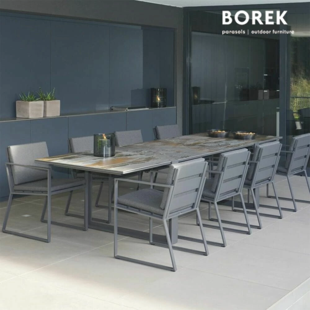 Die Gartenmöbel des Herstellers Borek zeichnen sich durch dauerhafte Stabilität und ein modernes Design aus. Eine hochwertige Aluminiumlegierung, die bei 180 Grad pulverbeschichtet wurde, bildet das Gestell der Möbel. Hinzu kommt eine Tischplatte aus Dekton. Das Material ist beständig gegenüber Kratzern, Hitze, Kälte, UV-Strahlung und ist farbecht. Die Tische sind somit absolut wetterfest. Neben Gartentischen bietet der Hersteller auch Loungemöbel, Gartenliegen und Sonnenschirme an, die Sie ebenfalls in unserem Shop online bestellen können.