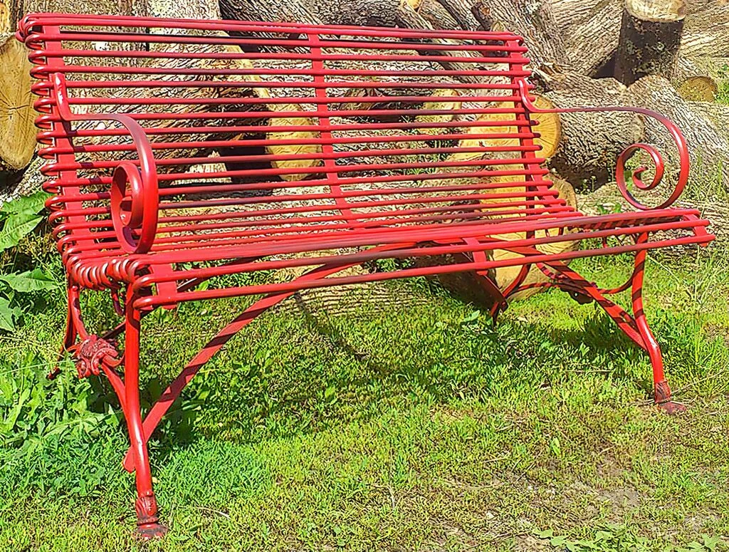 Schöne 2-Sitzer Sitzbank für den Garten im antiken Design. Diese einzigartige Gartenbank wird in Handarbeit in einer traditionsreichen Kunstschmiede aus hochwertigem Schmiedeeisen gefertigt. Als Vorlagen dienen nostalgische Gartenbänke aus dem 19. Jahrhundert, die man damals in zahlreichen französischen Gärten und Parks fand. Ein besonderer Hingucker sind die in Form von Löwenklauen gestalteten Füße der Bank. Ob auffallend rot oder klassisch grün, diese Gartenbank kann innerhalb der RAL Farbpalette nach Ihren Wünschen gefertigt werden. Dank der Lackierung ist die Bank rostfrei und kann dauerhaft im Garten aufgestellt werden.