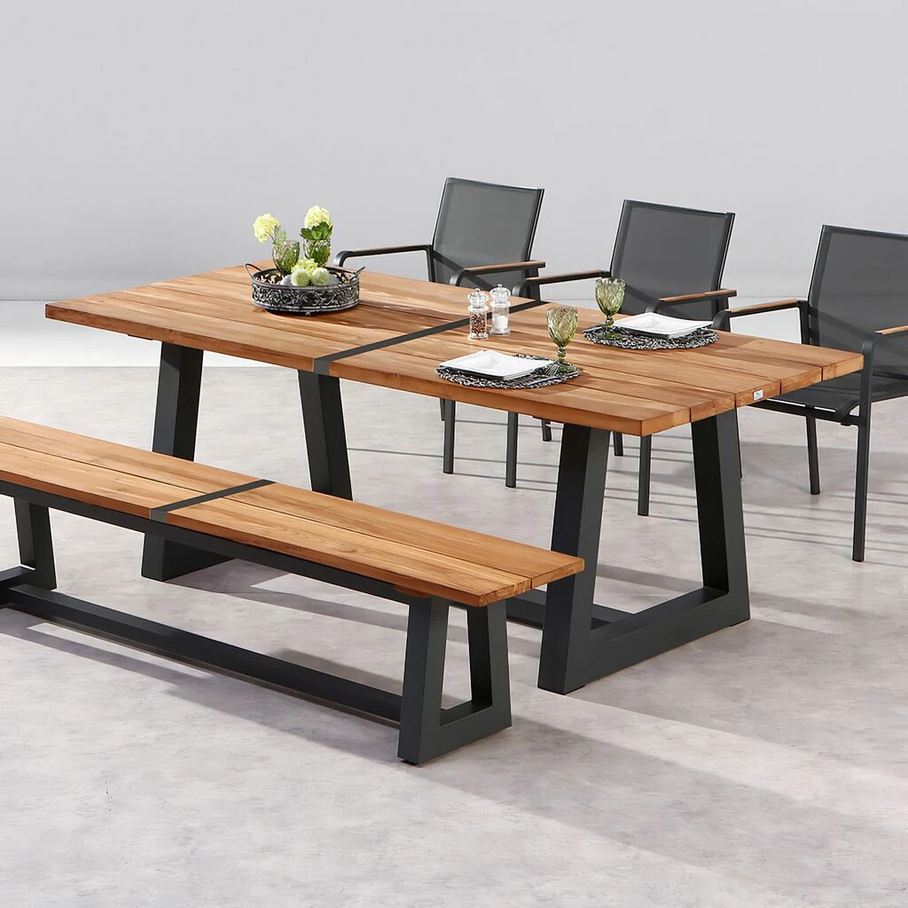 Unsere hochwertigen Gartenmöbel zeichnen sich durch eine hohe Robustheit gegenüber Witterung aus. Egal ob auf dem Balkon, auf der Terrasse oder im Garten platziert, besticht das Möbel-Set durch ein elegantes Design. Die Sitzfläche sowie die Tischplatte werden aus Recycle-Teakholz gefertigt, welches sich durch eine individuelle Maserung auszeichnet und sehr robust gegenüber Nässe ist. Dies unterstreicht nicht nur die Einzigartigkeit der Sitzgruppe, sondern auch die umweltbewusste Herstellung im handwerklichen Betrieb. Das schwere Gestell aus rostfreiem Aluminium sorgt für eine hohe Standfestigkeit und wird farblich pulverbeschichtet. Die Stühle werden mit einem Ergotex-Gewebe bespannt. Das Material ist atmungsaktiv, strapazierfähig und besonders bequem. Passende Auflagen für die Gartenbank und Stühle finden Sie in unserem Shop.