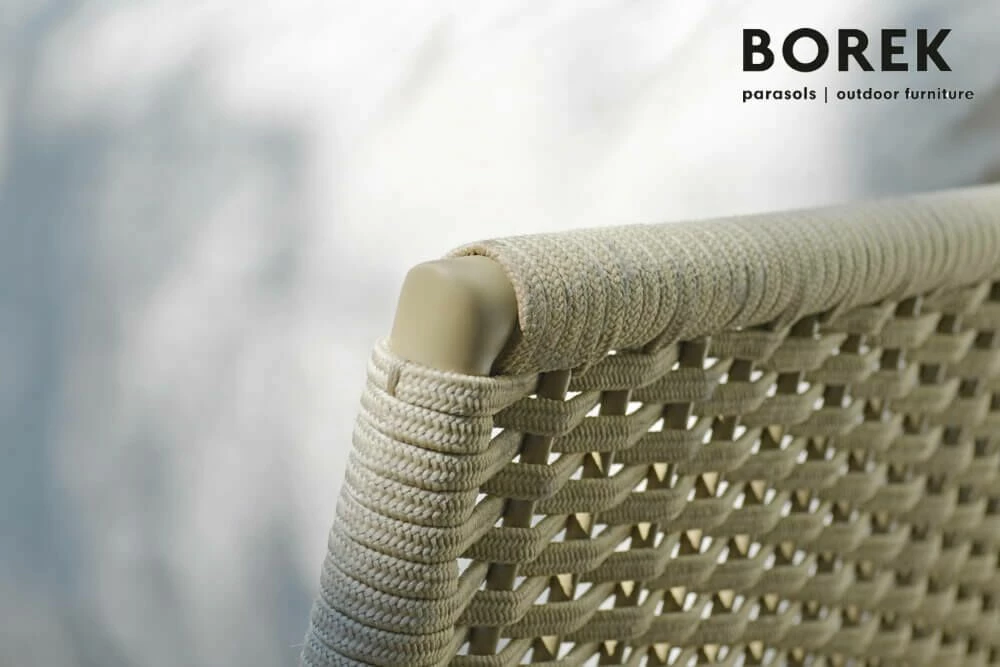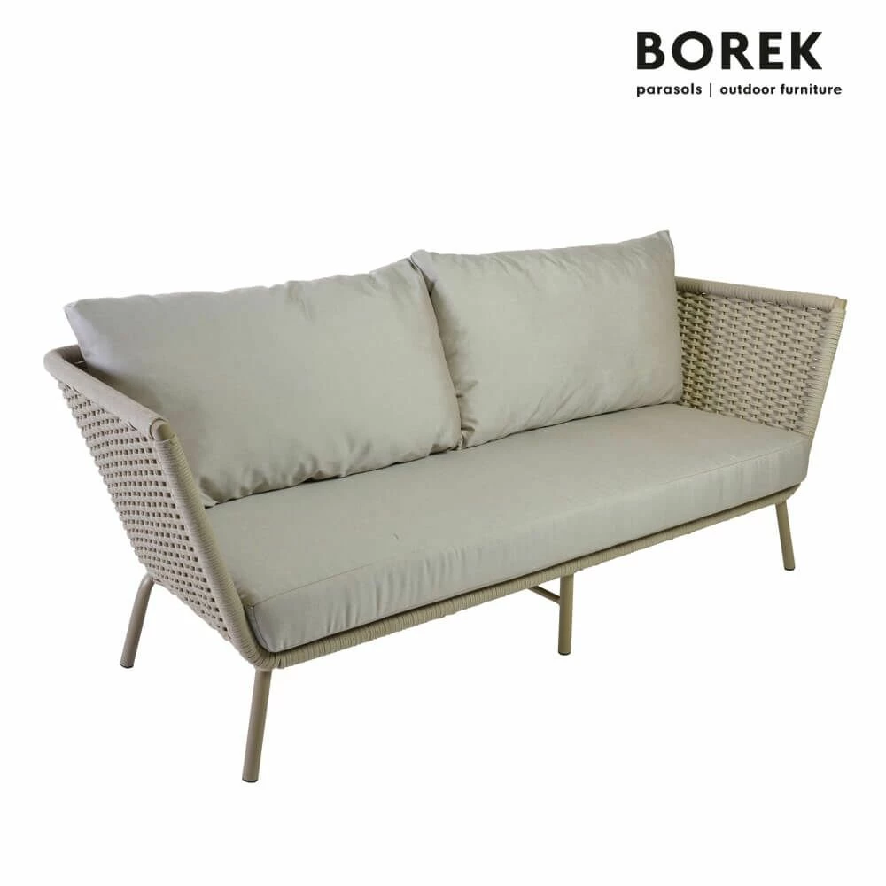 Das Outdoor Sofa VALLDEMOSSA des bekannten Gartenmöbel Herstellers BOREK überzeugt mit erstklassiger Verarbeitung und einem modernen Design. Der hochwertige Aluminiumrahmen ist mit einem thermoplastischem Seil umspannt. Das bequeme Gartensofa für 2-3 Personen wird inklusive robuster Polster Kissen geliefert. Kombiniert mit den passenden Gartensesseln der Serie oder einem hochwertigem Gartentisch lassen sich ansprechende Sitzecken im Garten oder auf der Terrasse gestalten.