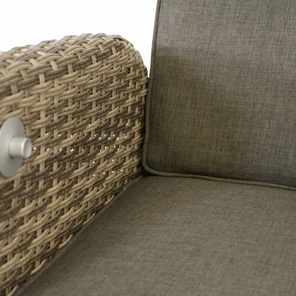 Dieser robuste Gartenstuhl wird unter ständiger Qualitätskontrolle aus Aluminium gefertigt. Das Polyrattan besteht aus 8x2mm halbrunden, grau-braunen Doppelsträngen. Als Auflagen werden schmutz- und wasserabweisende Spun-Polyester-Bezüge (220gr/qm) verwendet. Die Outdoor-Möbel sind beständig gegenüber Witterung und können ganzjährig im Außenbereich eingesetzt werden. Zur Reinigung sind Wasser und ein Schwamm ausreichend. Von säurehaltigen Reinigungsmittel wird abgeraten. Diese können die Oberfläche schädigen und zu einem Verlust der Wetterbeständigkeit führen.