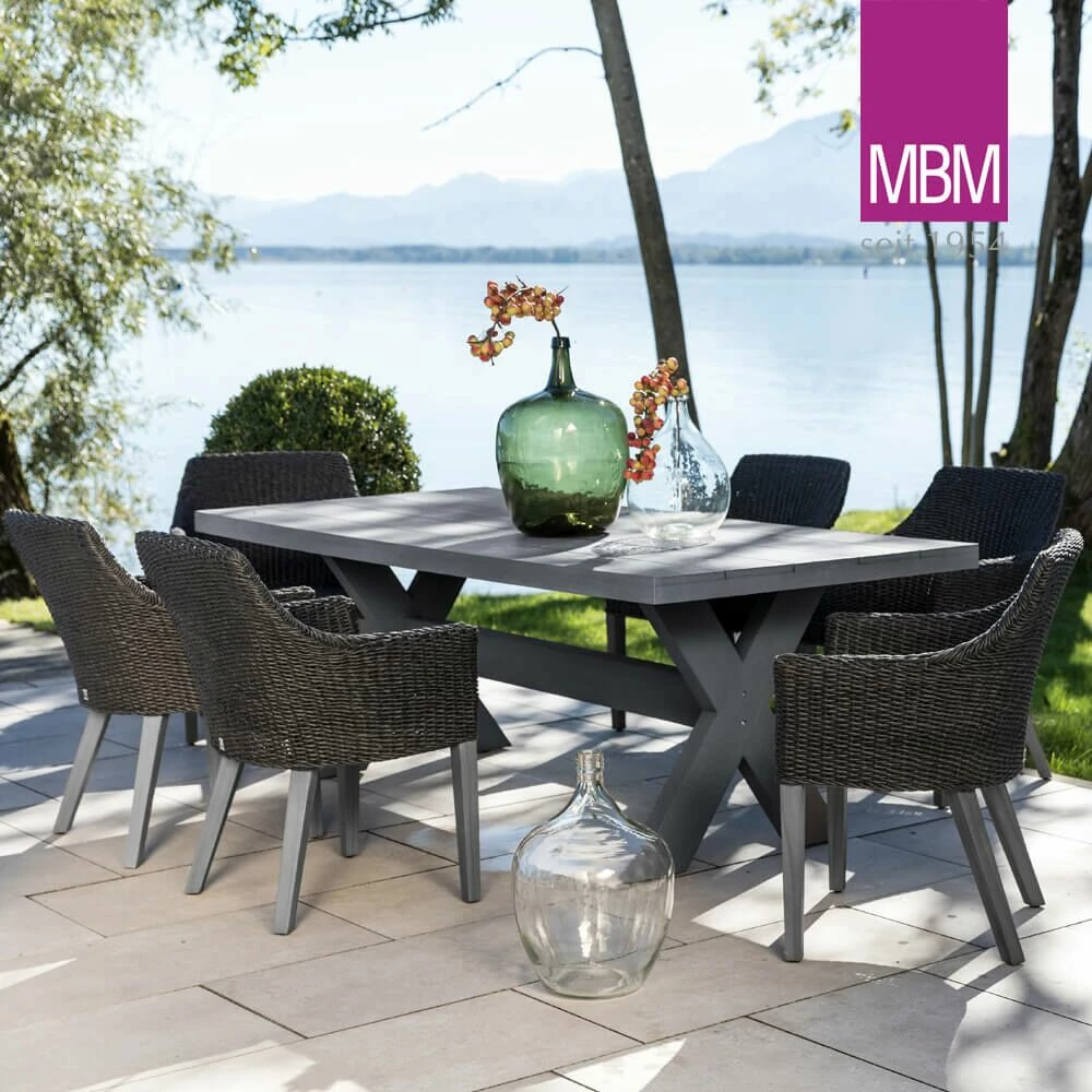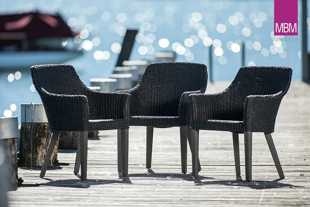 Die Gartenmöbel der Serie Tortuga kommen rustikal mit dem Charme des Kolonialstils daher. Ein großer Gartentisch wird mit einer beliebigen Anzahl von Gartensesseln kombiniert. Gefertigt wird die Serie aus Resysta und Mirotex, den eigens von MBM entwickelten Materialien. Diese wirken so wie echtes Holz und Rattan, sind dabei aber extrem witterungsbeständig. Resysta bleicht nicht aus, ist pflegeleicht, besonders langlebig und außerdem recycelbar und nachhaltig.