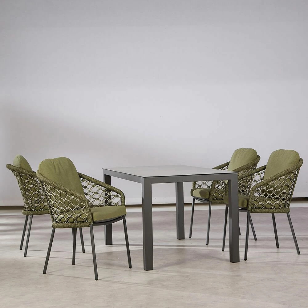 Unsere hochwertigen Gartenmöbel zeichnen sich durch eine hohe Robustheit gegenüber Witterung aus. Egal ob auf dem Balkon, auf der Terrasse oder im Garten platziert, besticht die Sitzgruppe durch ein elegantes Design. Die Sitzfläche wird per Hand mittels eines Polyacryl-Melange-Geflechtes verarbeitet. Das Material ist wasser- und reißfest. Die besondere Knüpftechnik in Makramee-Art bietet einen hohen Sitzkomfort. Der Bezugstoff der Auflagen besteht aus Sunbrella-Stoff, einem wasserabweisenden und pflegeleichten Polyacryl. Die Kissen unterliegen dem Öko-Tex Standard 100. Gefüllt sind die Bezüge mit einem Fast-Dry-Foam. Das Gestell besteht aus pulverbeschichteten Aluminium, einem leichten, rostfreien und wetterbeständigem Metall. Die Tischplatte wird kratzfest und robust aus einer Keramik-Schicht mit einer 10mm starken, bruchsicheren Glasplatte gefertigt. Die Tischbeine sind mit Ausgleichsschrauben ausgestattet, sodass der Gartentisch auch auf unebenem Untergrund sicher steht.