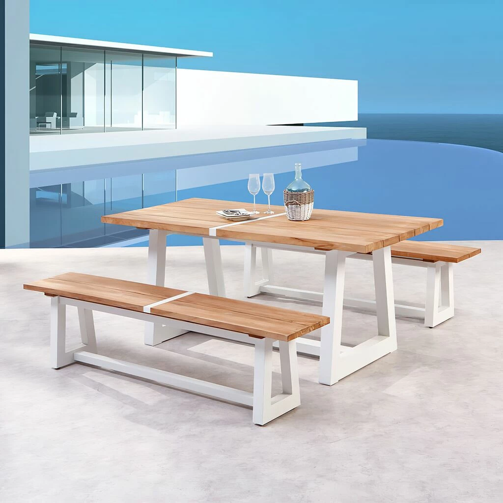 Unsere hochwertigen Gartenmöbel zeichnen sich durch eine hohe Robustheit gegenüber Witterung aus. Egal ob auf dem Balkon, auf der Terrasse oder im Garten platziert, besticht das Möbel-Set durch ein elegantes Design. Die Sitzfläche sowie die Tischplatte werden aus Recycle-Teakholz gefertigt, welches sich durch eine individuelle Maserung auszeichnet und sehr robust gegenüber Nässe ist. Dies unterstreicht nicht nur die Einzigartigkeit der Sitzgruppe, sondern auch die umweltbewusste Herstellung im handwerklichen Betrieb. Das schwere Gestell aus rostfreiem Aluminium sorgt für eine hohe Standfestigkeit und wird farblich pulverbeschichtet. Passende Auflagen für die Gartenbank und Stühle finden Sie in unserem Shop.