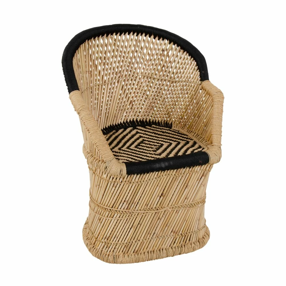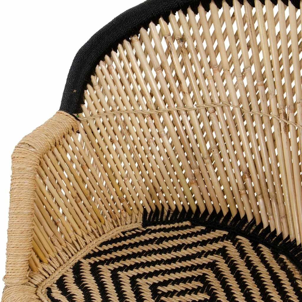 Der außergewöhnliche Gartensessel ist aus Bambusholz gefertigt und erhält schwarze Verzierungen. Eine Aufstellung auf trockenem Untergrund ist empfohlen.
