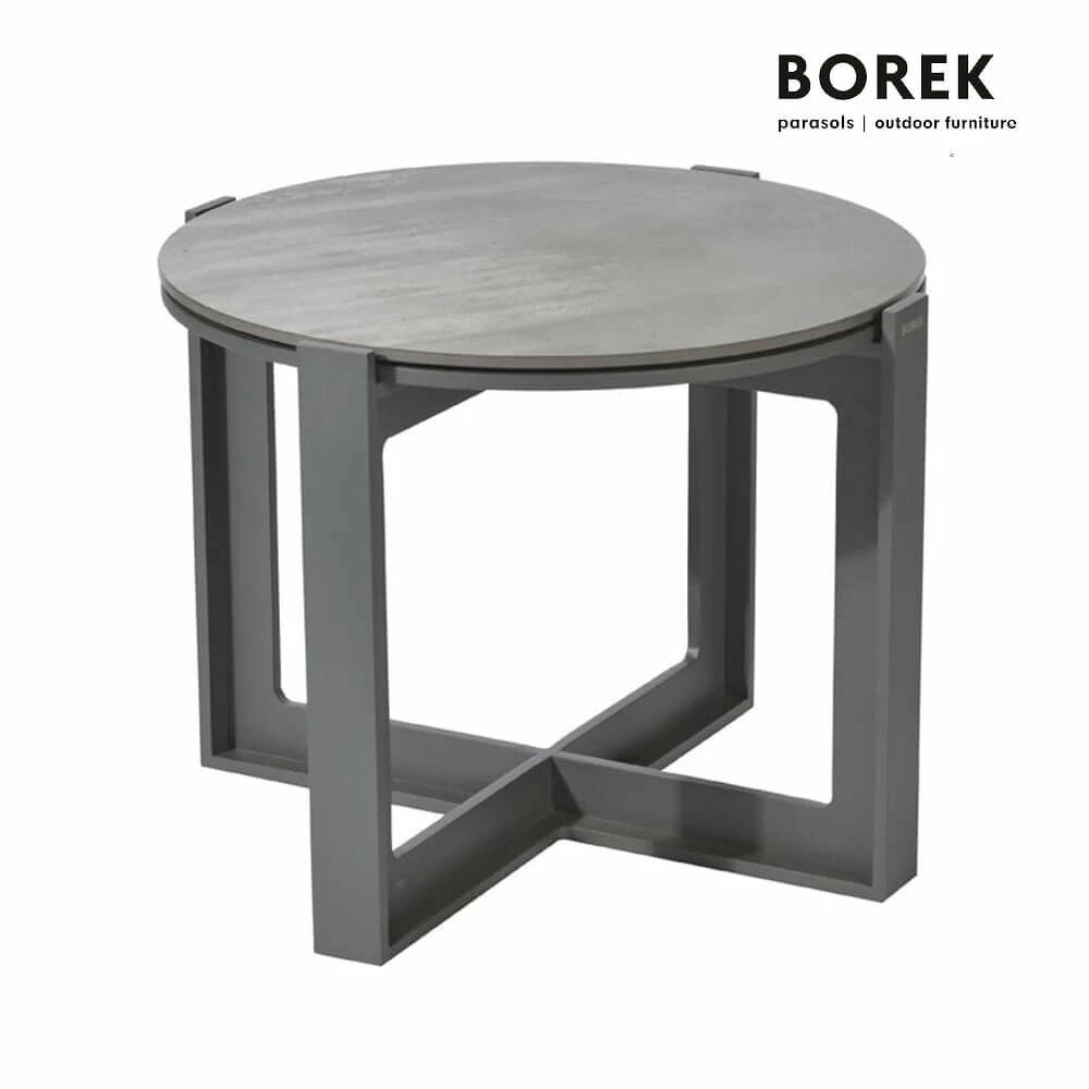 Der kleine Beistelltisch wird mit einem Aluminiumgestell in Anthrazit und einer extrem robusten Dekton-Tischplatte gefertigt. Die Tischplatte erhält ein einzigartiges Muster mit braunen Schattierungen.