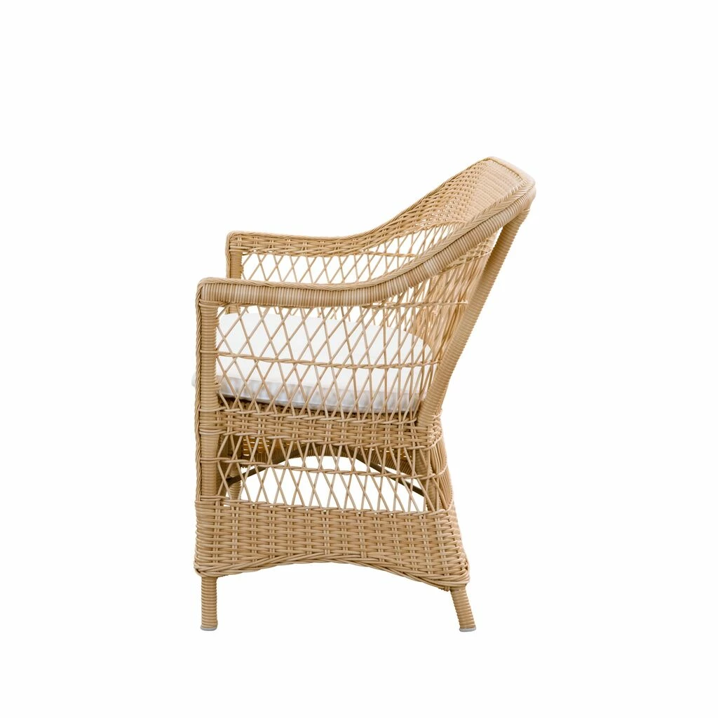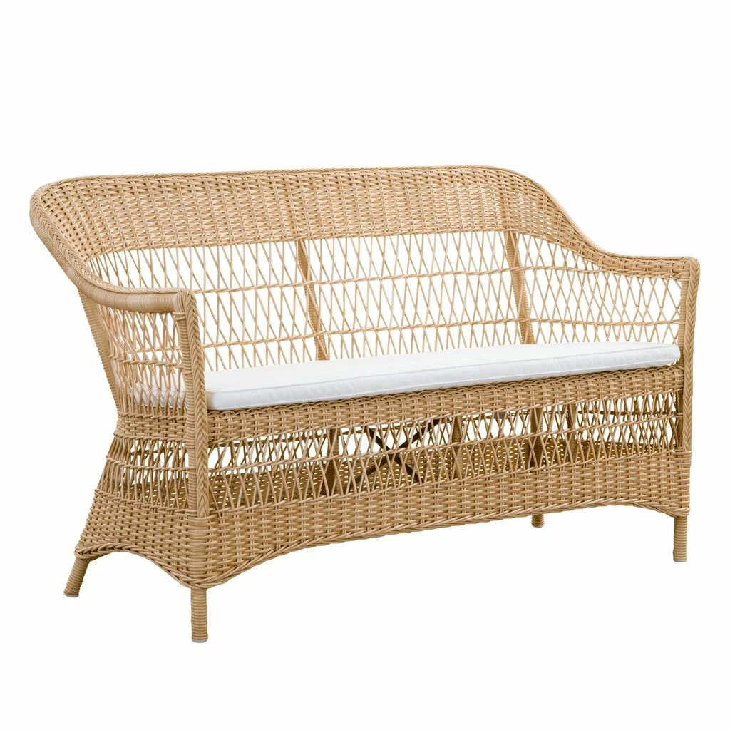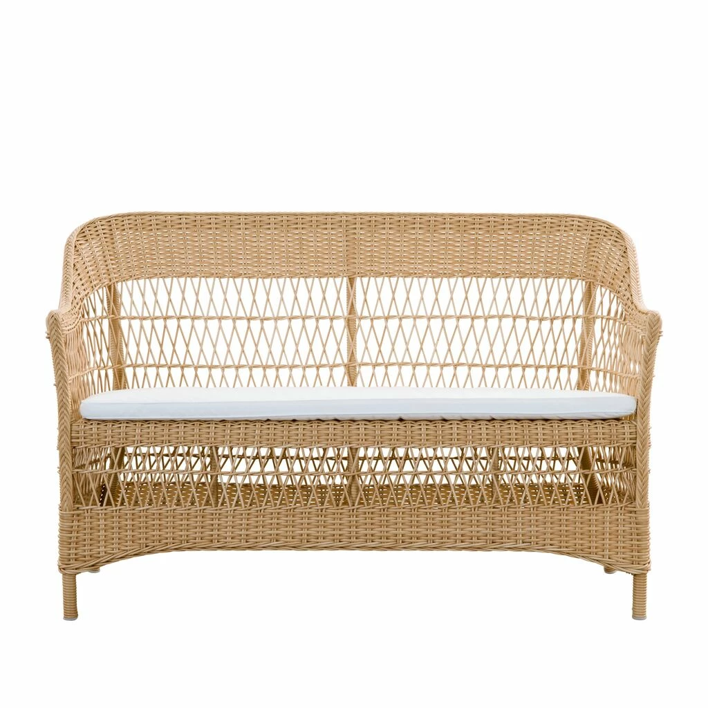 Dieses Gartensofa bietet ausreichend Platz für zwei Personen und überzeugt mit einem elegant romantischen Design. Das Gestell des wetterfesten Gartensofas wird aus Aluminium angefertigt und mit einer robusten Kunstfaser umflochten. Diese erinnert stark an echtes Rattan, hat jedoch wetterbeständige Eigenschaften, wodurch das Outdoor Sofa ganzjährig im Freien verbleiben kann.
