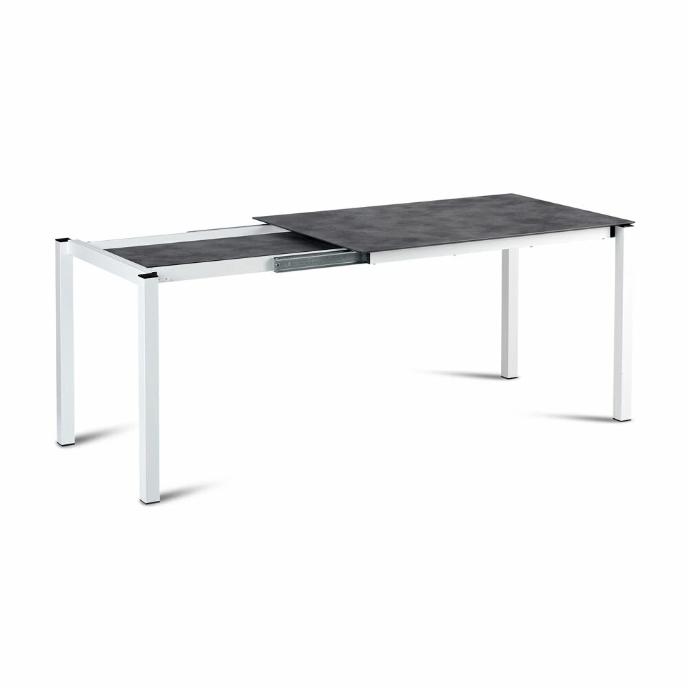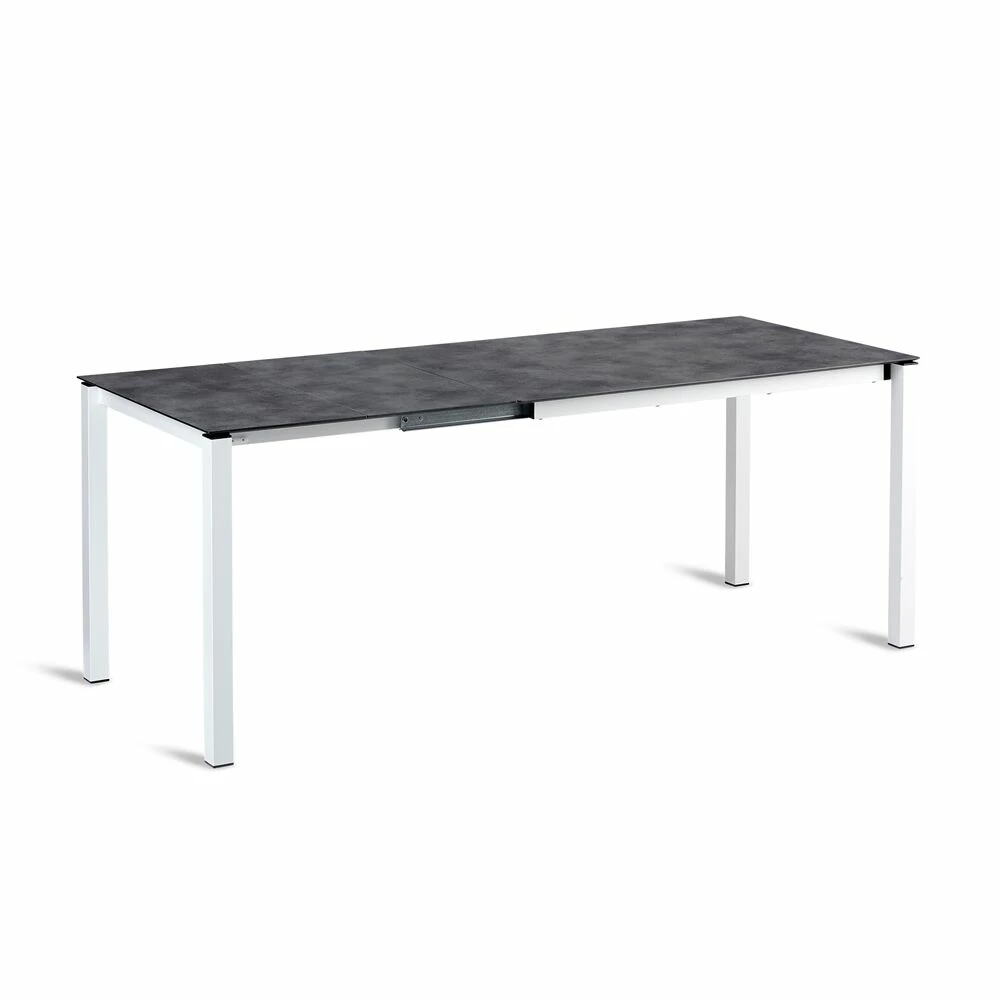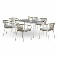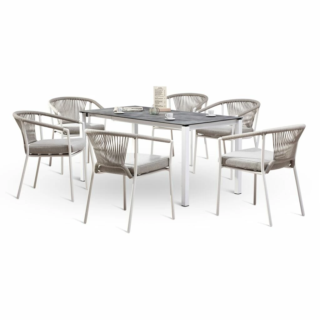 Unsere hochwertigen Gartenmöbel zeichnen sich durch eine hohe Robustheit gegenüber Witterung aus. Egal ob auf dem Balkon, auf der Terrasse oder im Garten platziert, besticht die Sitzgruppe durch ein elegantes Design. Die Sitzgruppe hat Aluminiumgestelle. Die Sitzfläche ist aus einem Acrylic-Rope und somit witterungsbeständig sowie schnelltrocknend. Die Bezüge der Sitzkissen können zum Waschen mittels Reißverschluss abgenommen werden. Der Stuhl wird montiert geliefert mit einer Rückenlänge von 36 cm. Die Tischplatte kann von 160 auf 210 cm verlängert werden und ist aus kratzfestem HPL in Cement-Optik.