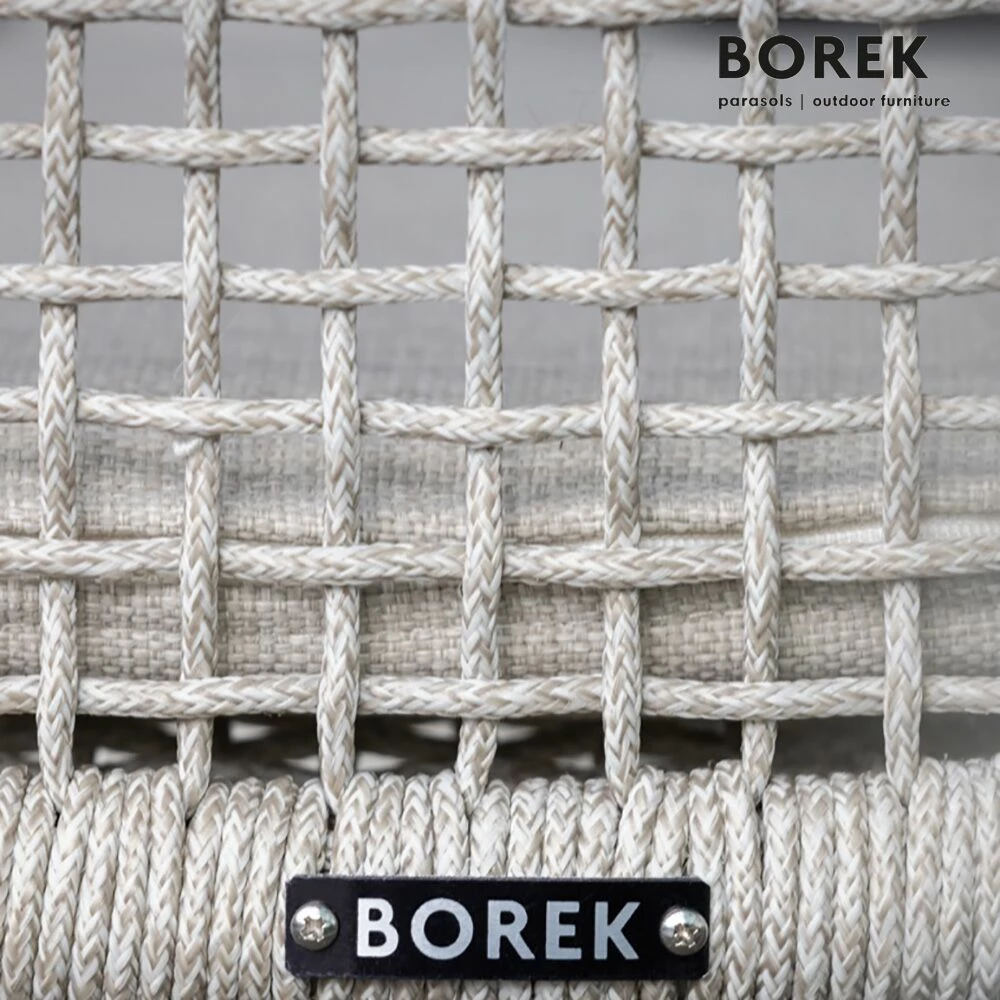 Die Gartenmöbel des Herstellers Borek zeichnen sich durch eine dauerhafte Stabilität und ein modernes Design aus. Eine hochwertige Aluminiumlegierung, die bei 180 Grad pulverbeschichtet wurde, bildet das Gestell der Möbel. Der Gartensessel ist frost- und hitzbeständig sowie pflegeleicht. Neben Gartenstühlen bietet der Hersteller auch Loungemöbel, Gartenliegen und Sonnenschirme an, die Sie ebenfalls in unserem Shop online bestellen können. Das Ardenza-Seil kann mit dem Borek Fabric Cleaner gerinigt und mit dem Borek Fabric Protector geschützt werden.