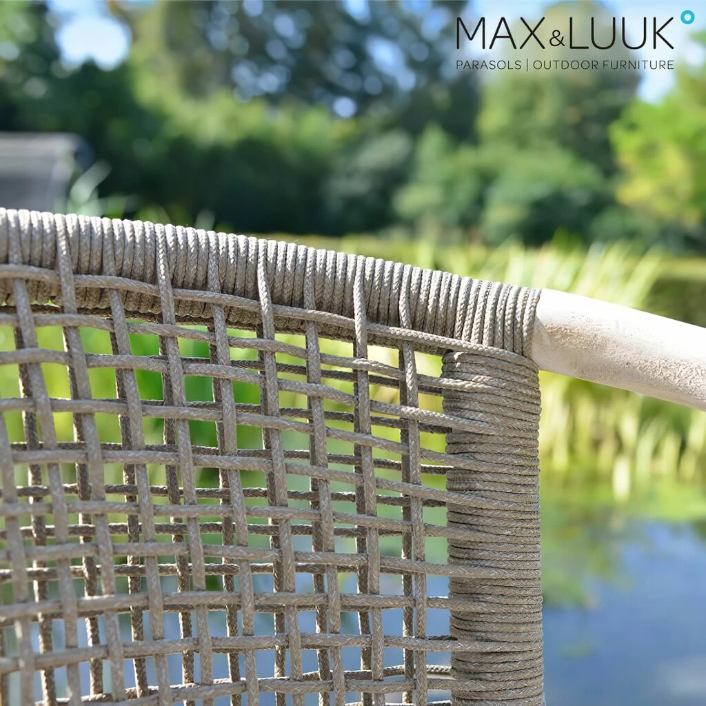 Die Sitzfläche und die Rückenlehne des Gartenmöbels sind mit einem Allwetterseil bespannt. Dabei handelt es sich um ein innovatives und starkes Material, welches den Sitzmöbeln von Max & Luuk ein aufregendes und modernes Design verleiht. Das weiche Seil erhöht den Sitzkomfort. Es besteht aus thermoplastischen Polypropylenfasern und erfüllt alle Anforderungen, die für ein Gartenmöbel wichtig sind. Die Bespannung ist feuchtigkeitsbeständig, farbecht, waschbar und besonders pflegeleicht sowie unempfindlich gegenüber UV-Einstrahlung und Temperaturunterschieden. Das Gewebe enthält kein PVC und trotzt Schimmel sowie Mehltau. Die Reinigung mit einem Hochdruckreiniger wird nicht empfohlen. Stattdessen sollte die Faser mit Fabric Cleaner und Fabric Protector gepflegt und gereinigt werden.