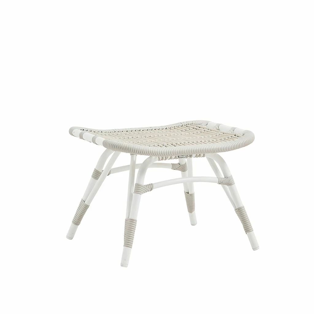 Die Fußbank ist das passende Pendant zum ELINA Gartensessel bei Gartentraum. Der wetterfeste Fußhocker aus Aluminium und Polyrattan erstrahlt in weiß. Passende Kissen für den Hocker gibt es in verschiedenen Farben.