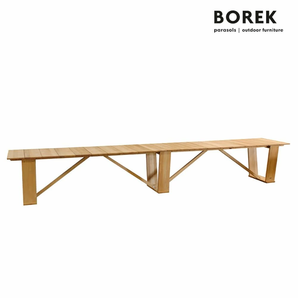 Für die Hochzeitsfeier, den Kindergeburtstag oder die Gartenfeier sind Sie mit diesem extra großen Gartentisch bestens vorbereitet. Er wird aus hochwertigem Teakholz gefertigt und überzeugt mit einem rustikalen Design und beständiger Qualität. Die am Boden miteinander verbundenen Tischbeine und Stützstreben verleihen dem Tisch dauerhaft Stabilität. Teakholz ist aufgrund des hohen Gehalts an natürlichen Ölen sehr beständig. Es nimmt kaum Wasser auf und ist so gut wie resistent gegen Schimmel und Schädlingsbefall. Mit einer Länge von 5 m und einer Breite von 90 cm lässt dieser Gartentisch der Kollektion ROMA in Sachen Platz keine Wünsche offen. Mit den wetterfesten Gartenbänken aus Holz bieten wir Ihnen in unserem Shop zudem die passende Sitzgelegenheit. Alternativ können Sie auch Holzstühle oder Gartenhocker mit diesem Gartentisch zu einer großen Esstischgruppe kombinieren.