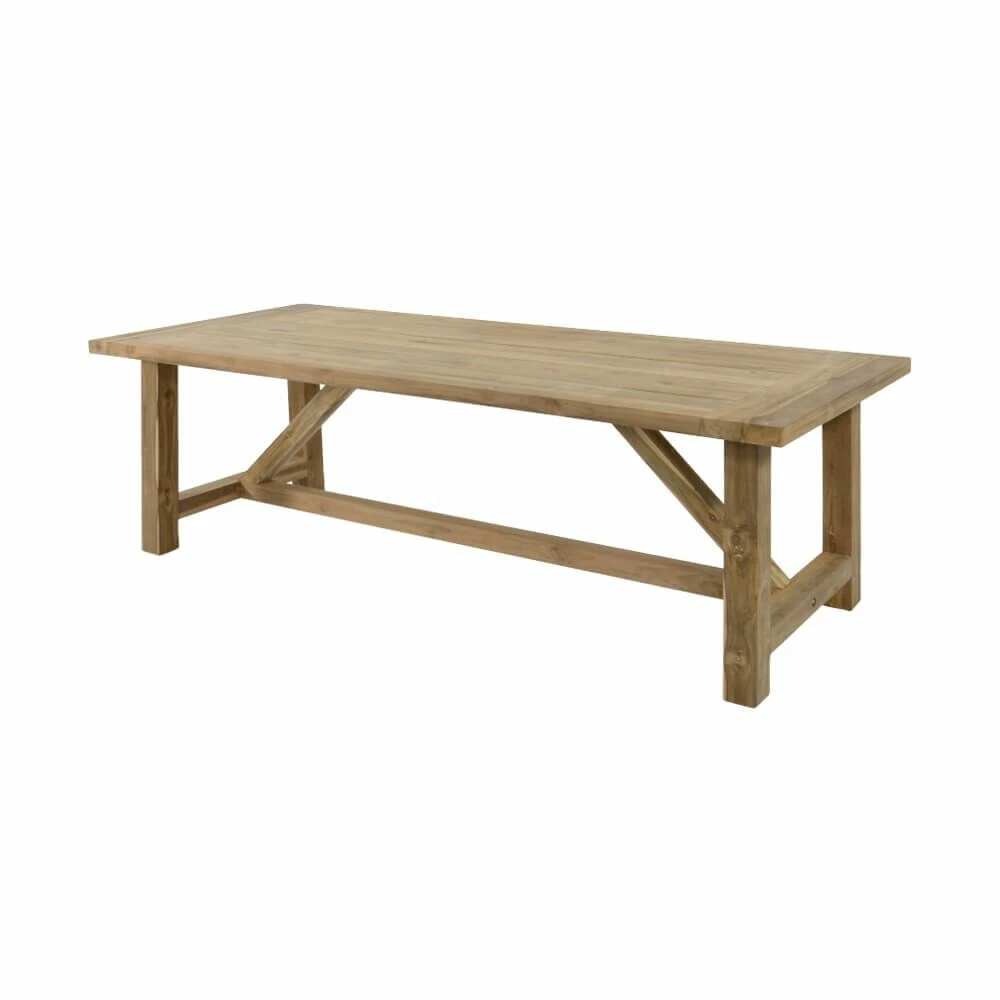 Dieser robuste Gartentisch wird unter ständiger Qualitätskontrolle aus recyceltem Holz gefertigt. Das Outdoor-Möbelstück ist robust und wetterfest. Zur Reinigung sind Wasser und ein Schwamm ausreichend. Von säurehaltigen Reinigungsmittel wird abgeraten. Diese können die Oberfläche schädigen und zu einem Verlust der Wetterbeständigkeit führen. Das Hartholz erhält im Laufe der Zeit eine natürliche Patina und sollte regelmäßig mit einem Öl und Sealer behandelt werden. Kleine Risse sowie kleine Löcher und Unregelmäßigkeiten haben einen natürlichen Ursprung und beeinträchtigen nicht die Qualität des Naturproduktes.